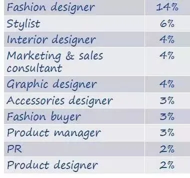 最热门前十职业是:服装设计师、造型师、室内设计师、市场及销售顾问、平面设计师、配饰设计师、时尚买手、产品经理、公关以及产品设计师。服装设计14%,造型6%