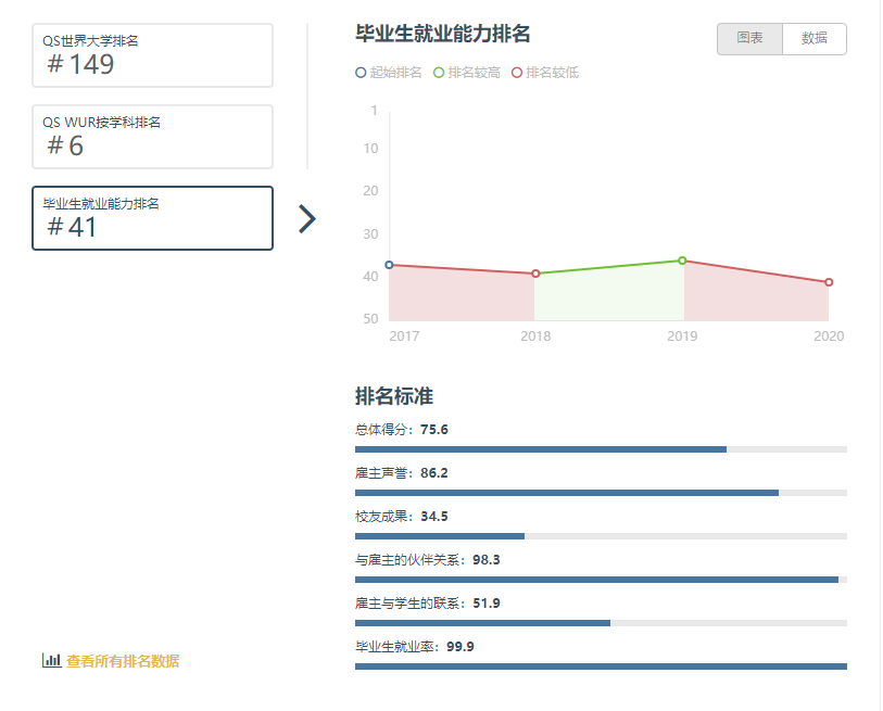 在QS世界大学排名的竞争力如下,全球41也是可以的了,就业率99.9%。