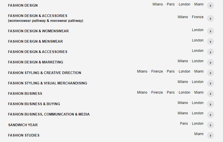 马兰欧尼的时尚专业划分会更加的细致,光是服装方面,就分为了设计、配饰、女装、男装,还相关的时尚造型、时尚研究、时尚媒体和时尚买手等专业。